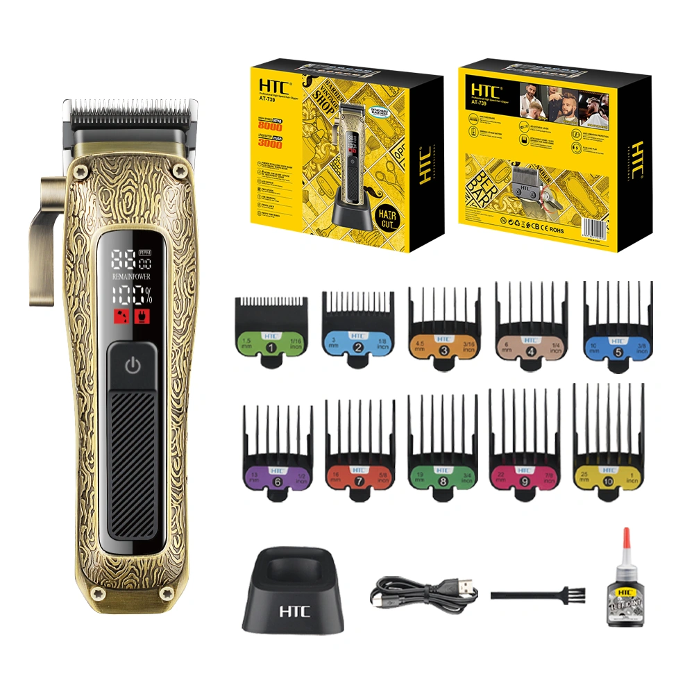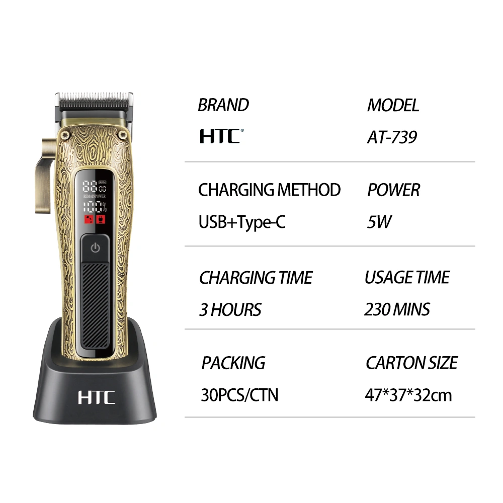 HTC AT-739 Ceramic Blade Hair Clipper Professional Barber Metal Body Hair Clipper Salon Use Charge Base 3s Travel Lock