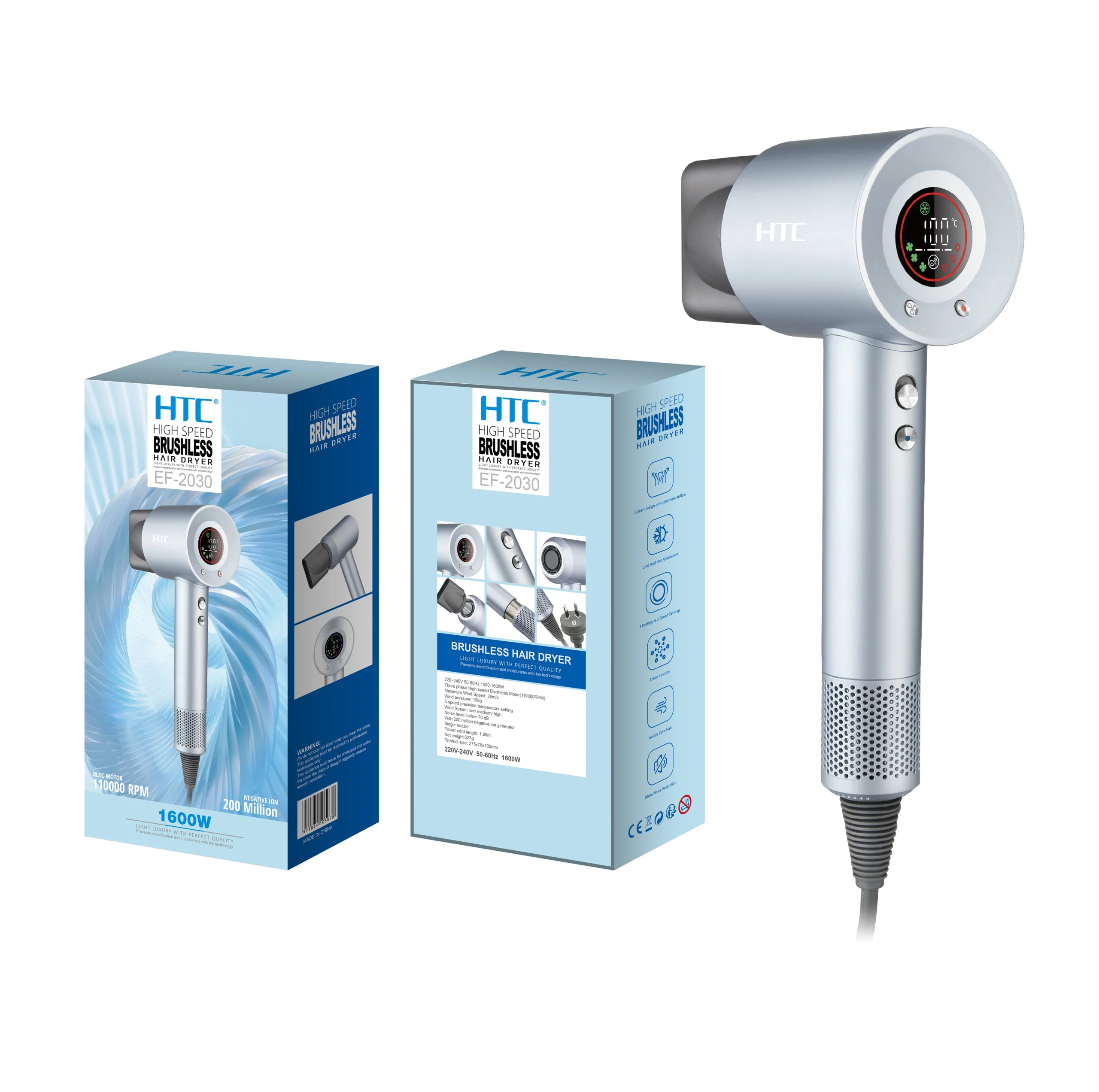 HTC EF-2030 Professional Barber Use Hair Dryer Brushless Motor with LCD Display High Speed BLDC Dryer